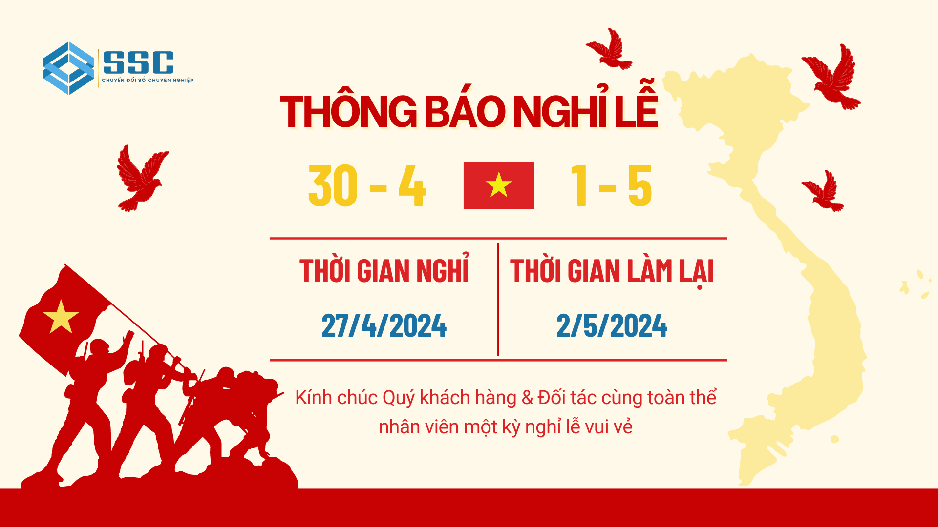 Công ty Cổ phần Giải pháp phần mềm SSC xin trân trọng thông báo lịch nghỉ lễ 30/4 và 1/5/2024